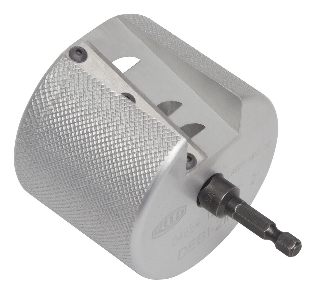 Integrated shaft for drill power operation. Knurled grip for slip-resistance and durable aluminum body for longevity. Deburr and chamfer in the same rotation. Suitable for PVC, CPVC, PE, ABS and PP. Three sizes of pipe accommodated per tool.