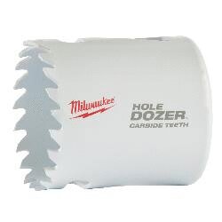 Our Milwaukee® Hole Dozer™ with carbide teeth is the best hole saw solution for metal and multi-material applications. The Hole Dozer™ provides 50X life in extreme metal and multi-material cutting compared to other bi-metal hole saws. A tough carbide grade is combined with a durable 4 TPI tooth design, yielding the best durability and longest life in stainless steel, abrasive material and fastener embedded wood applications. The Hole Dozer™ has a cutting depth of 1.62 in, allowing clearance to handle cuts in a wide range of materials. Thermoset coating on the saw reduces friction and drag during cutting, generating cordless efficiency for faster cutting in all applications. The material slug is easy to remove with the Plug Jack™ T-Slot. Plug Jack™ enhances user productivity by providing the best access and leverage to remove material slugs. All Hole Dozer™ products are made in the USA.