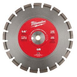 Milwaukee® diamond blades are designed to the highest standards, only using quality diamonds. Available in sizes 4 to 14 in Milwaukee® diamond blade line will cover a full range of materials including specialized blades for green concrete, asphalt, and ductile iron. All Milwaukee® blades are designed for both wet and dry cutting. Features For use in green concrete and highly abrasive materials such as asphalt. Extended life. Fast cutting. 1 in, 20 mm Arbor. Designed to be used wet or dry 17014.