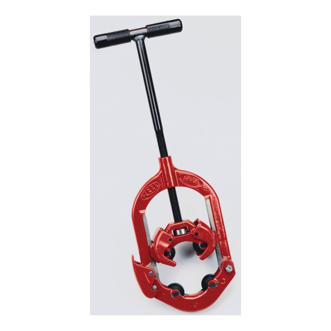 Four wheels cut steel, stainless steel, cast and ductile iron with only 90 deg to 110 deg handle swing. Only 4 in (102 mm) clearance required around pipe. Strong guide fingers ensure perfect wheel alignment for square cuts. A closed 360 deg frame forces all energy into cutting the pipe for maximum efficiency and productivity. There is no shower of sparks in this cold cut. This is the only hinged cutter that tracks every time and the only one recommended for ductile iron, steel and stainless steel to Schedule 100. This tool is a Reed invention.