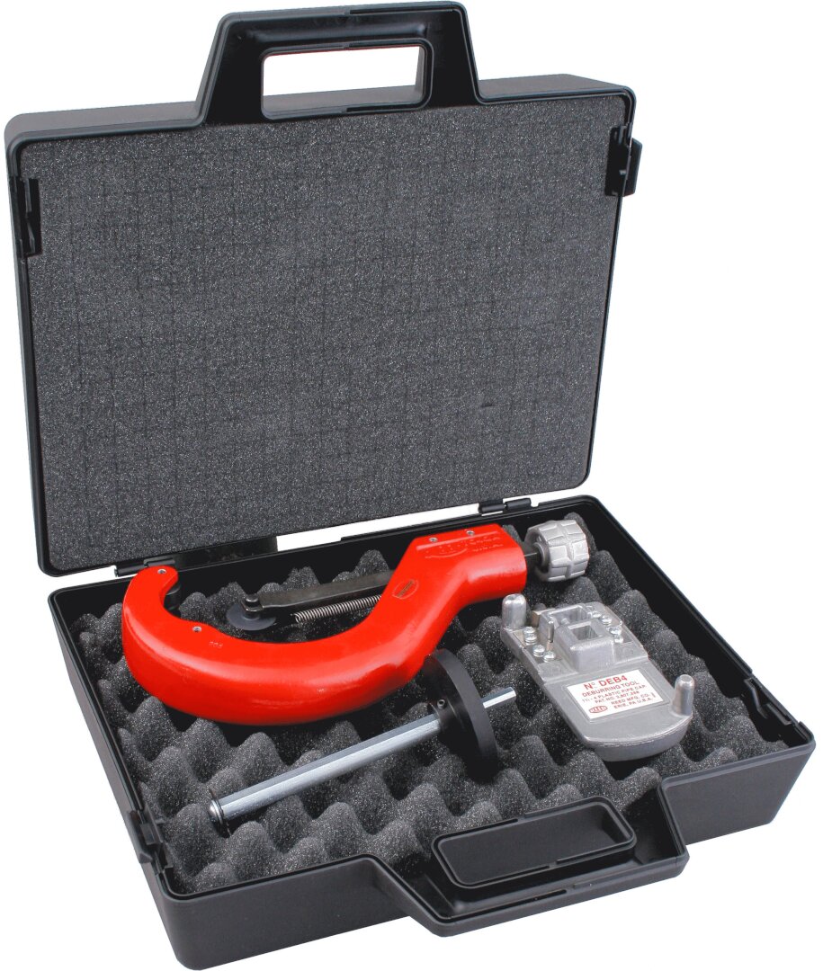 These kits contain tools required to install a perfect joint every time to prevent failures between pipe and fitting. The Quick Release tubing cutter provides quick, square cuts on plastic pipe. DEB4 deburring tool creates a proper 15 degree chamfer for even distribution of solvent cement. DEB1 models deburr and chamfer three sizes of plastic pipe. The IC1SL Internal Pipe Cutter yields a uniform internal cut in hard-to-reach places where a tubing cutter will not fit. All tools are contained in a lightweight, hard plastic case.