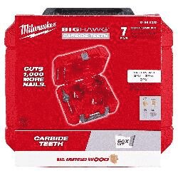 Our Milwaukee® BIG HAWG™ with carbide teeth is the best hole saw solution for nail-embedded wood and abrasive material applications. Our first-to-market hole saw offers extreme life utilizing advanced carbide technology. The BIG HAWG™ gives users 50X more life in demanding applications with the ability to cut 1000+ more nails. The heavy duty hole saw has 10X larger carbide teeth that rip through materials five times faster. Deeper slots allow for fast and easy plug removal. Our BIG HAWG™ hole saw is the best solution for cutting through the toughest materials, including nails, cement board, shingles, plaster and stucco. Our kit includes four BIG HAWG™ hole saws, two pilot bits and a diamond file.