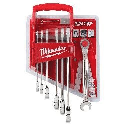 Milwaukee® ratcheting combination wrenches offer an industry leading 2.5 deg of arc swing, allowing our users to work quickly and efficiently even in the tightest of spaces. Our durable double stacked pawls in the ratcheting mechanism offer longest ratchet life and best access with 144 ratcheting positions. The MAX BITE™ open end grip improves the wrench grip on nuts and bolts, offering 25% more torque than smooth-faced wrenches. The comfortable I-Beam handle design allows superior user comfort. Milwaukee® wrenches feature ink-filled size labels for easy size identification, as well as quick distinction between SAE and metric sets. The 15-piece sets come in trays designed for steel storage drawers, allowing for efficient storage with no wasted space. The 7-piece kits come in a portable, locking storage tray, offering organization both on and off the jobsite. Standing behind our products, Milwaukee® offers a lifetime guarantee on all of our ratcheting combination wrench sets.