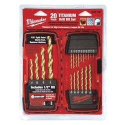 The 20-piece Milwaukee® titanium coated drill bit set offers convenience and heavy duty performance on the jobsite. Milwaukee® titanium coated drill bits are designed for extreme durability and upto 3X longer life. The tapered web resists side-load breakage, while the 3-Flat Secure-Grip™ shank holds the bit firmly in the drill chuck. The titanium coating reduces heat build-up and keeps the bit sharp to extend performance. The 135 deg split point tip delivers a precision start and prevents walking for fast, accurate holes.