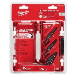Milwaukee® Step Drill Bits with JAM-FREE Performance feature a dual-flute design delivering upto 2X faster hole times, upto 4x longer life and upto 50" more holes per battery charge than competitors. Ideal for drilling small and large-diameter holes in steel and plastic, these bits are Optimized for Cordless Drills in High Speed. The Rapid Strike™ tip allows for a fast and accurate start that generates less heat, resulting in longer bit tip life. Black oxide coating also enhances durability, hole quality and bit life. For user convenience and accuracy, each bit has laser-engraved reference marks you can see while drilling. The 3-flat Secure-Grip™ shank ensures a solid connection with the drill chuck.