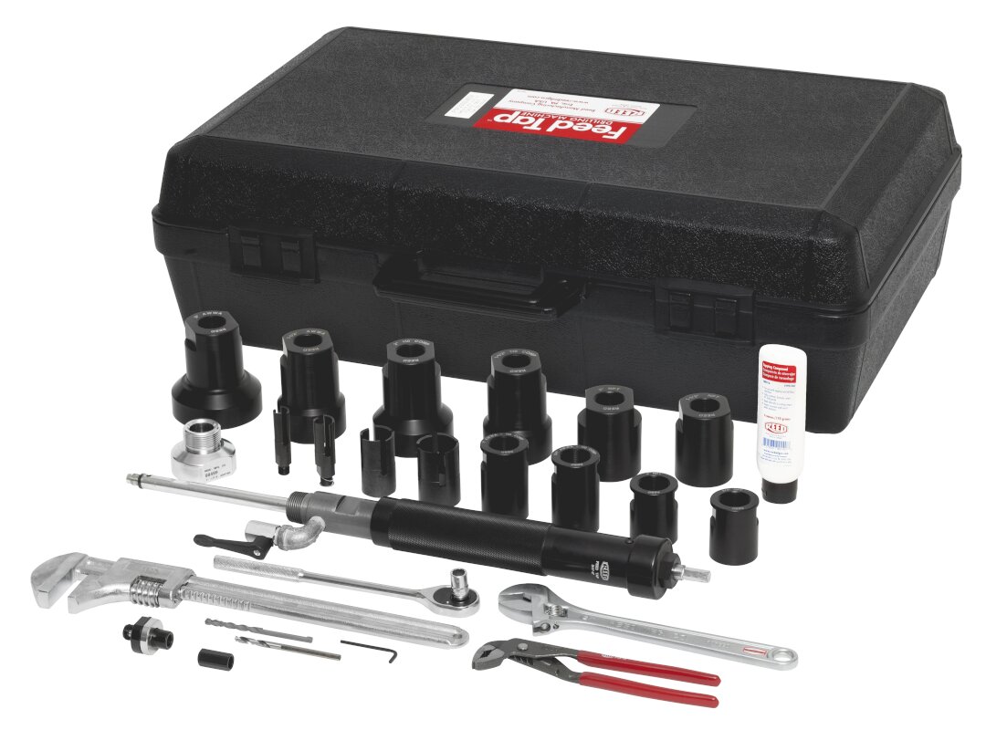 Reed's Feed Tap drills through PVC, PE, cast iron and ductile iron while under pressure. The compact design, featuring a separate feed for advancing the heavy-duty shell cutter into the pipe, allows the user to easily complete the tap using an electric or cordless drill, right angle drill for cast and ductile iron, or even a 7/16 in wrench (drill/wrench not included) with manual power for plastics. The independent feed control advances the shell cutter for tapping PVC pipe as recommended by Uni-Bell PVC Pipe Association. The FTB Feed Tap consists of the base unit which allows the user to purchase shell cutters and corporation adapters separately, as needed. A complete kit is sold as FT2000UNIV. The kit contains both a coupon retaining drill bit, CRPD25 and two sets of coupon retaining magnets. Plastic Pipe only FTP2000UNIV is used for manual drilling operations with Reed's proven PVC/PE Shell Cutters. The FTP2000UNIV comes complete with all corporation adapters, shell cutters, adapters and a ratchet wrench with socket to cover 3/4 to 2 in services in PVC and PE. Each machine ships with a sturdy carrying case.