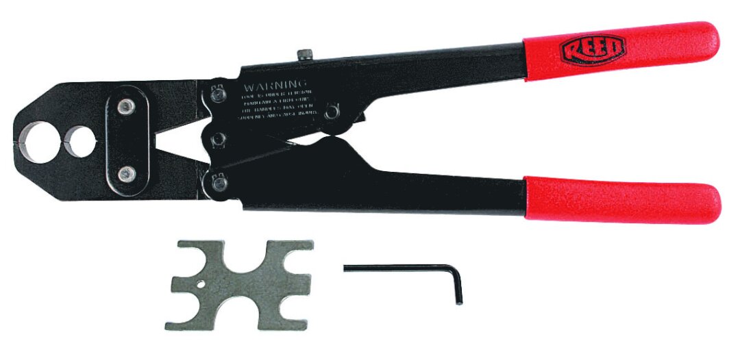 PEX Crimpers squeeze the copper rings used on PEX brass fittings. PEX Crimpers systems are used for potable water lines, radiant heat, snow melt and ice rink systems, among other applications. The design of these PEX crimpers eliminates tool marks and distortion on the rings. The tools crimp rings easily, making PEX installation a breeze. For one-hand use on 1/2 and 3/4 in PEX, consider the PEXOH12 or PEXOH34. Each Reed PEX Crimpers for copper rings comes with its own go/no-go gauge.