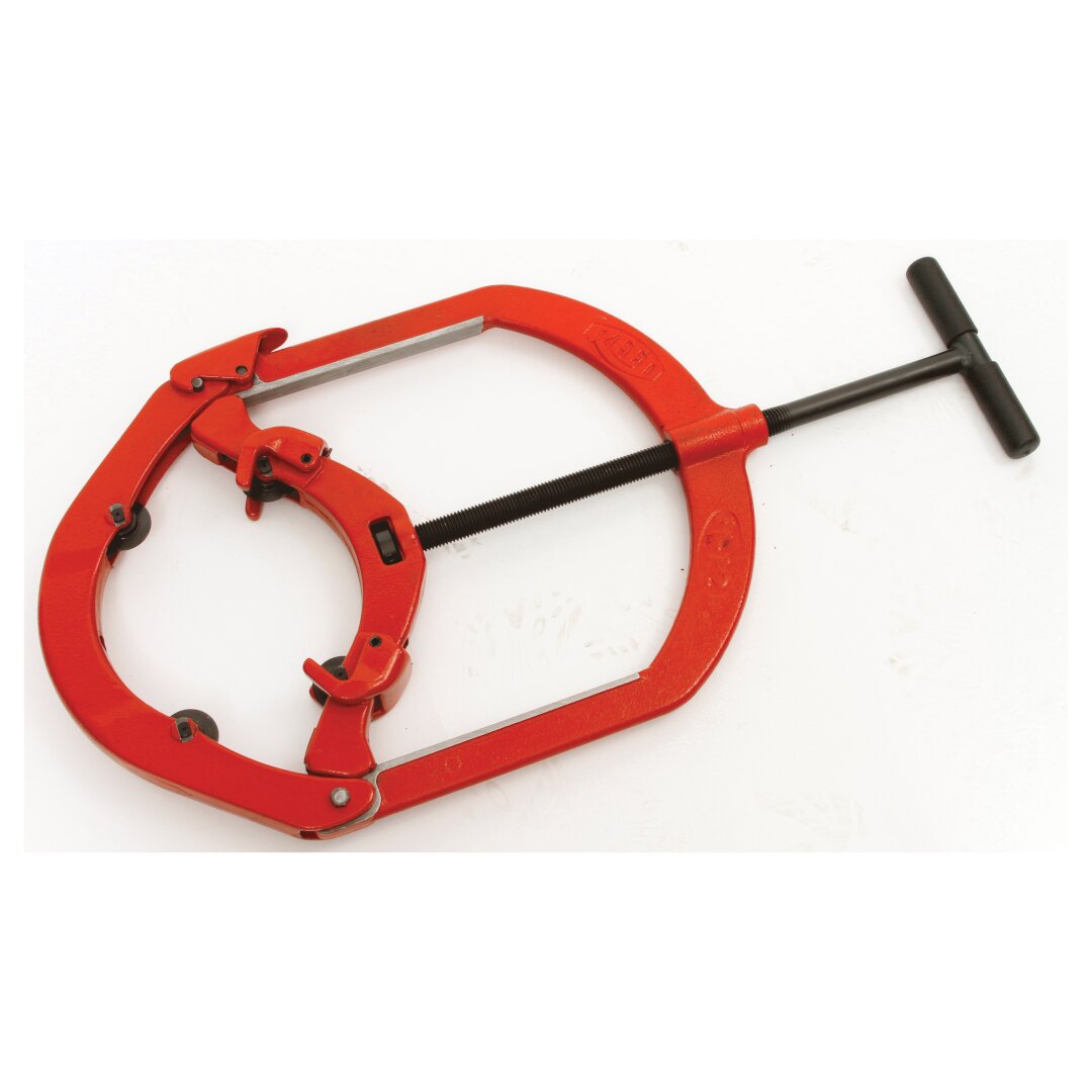Four wheels cut steel, stainless steel, cast and ductile iron with only 90 deg to 110 deg handle swing. Only 4 in (102 mm) clearance required around pipe. Strong guide fingers ensure perfect wheel alignment for square cuts. A closed 360 deg frame forces all energy into cutting the pipe for maximum efficiency and productivity. There is no shower of sparks in this cold cut. This is the only hinged cutter that tracks every time and the only one recommended for ductile iron, steel and stainless steel to Schedule 100. This tool is a Reed invention.