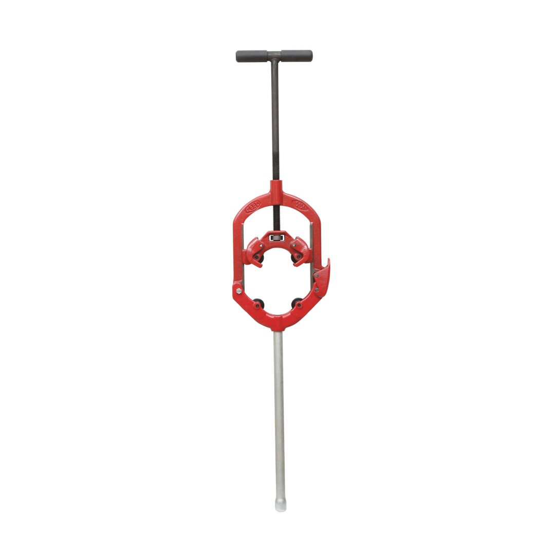 Special Hinged Cutters with an extra "helper handle" allow two people to make a team effort for bigger, tougher cuts. Hinged Cutters feature four wheels to cut steel, stainless steel, cast and ductile iron with only 90 deg to 110 deg handle swing. These models are ideal for cuts on well casing. Strong guide fingers ensure perfect wheel alignment for square cuts. A closed 360 deg frame on the hinged cutter forces all energy into cutting the pipe for maximum efficiency. There is no shower of sparks in this cold cut. Reed has the only hinged cutter that tracks every time and the only one recommended for ductile iron, steel, and stainless steel to Schedule 100. The Hinged Cutter is a Reed invention.