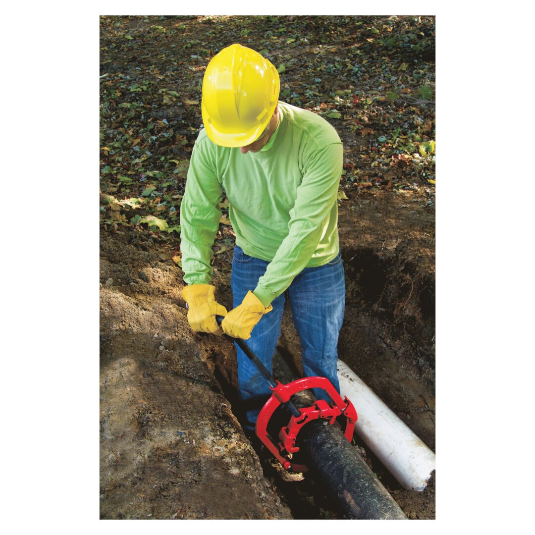Four wheels cut steel, stainless steel, cast and ductile iron with only 90 deg to 110 deg handle swing. Only 4 in (102 mm) clearance required around pipe. Strong guide fingers ensure perfect wheel alignment for square cuts. A closed 360 deg frame forces all energy into cutting the pipe for maximum efficiency and productivity. There is no shower of sparks in this cold cut. This is the only hinged cutter that tracks every time and the only one recommended for ductile iron, steel and stainless steel to Schedule 100. This tool is a Reed invention.