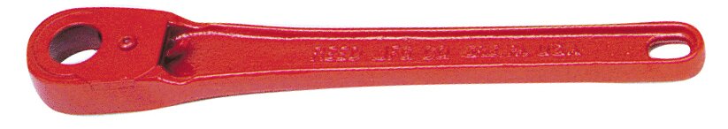 Durable, malleable iron, cast handle for strength. Uses retaining ring socket retention. Rugged construction of handle and ratchet mechanism.