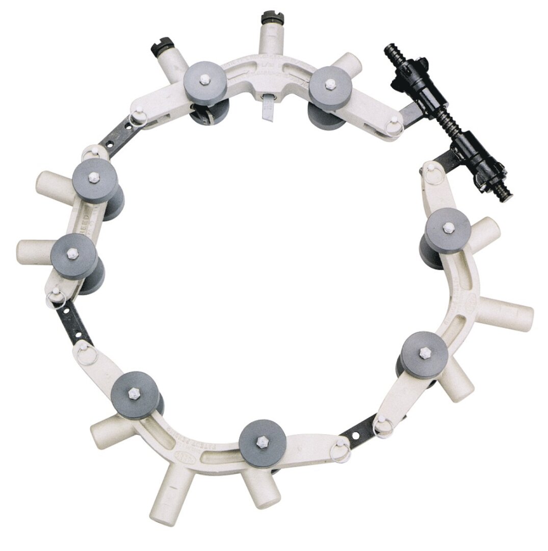 PLAS In-Line Rotary Cutters are excellent for cutting PVC or PE pipe in trench or above ground. Each PLAS rotary cutter needs just 6 to 8 in (153 - 203 mm) clearance around the pipe, making them easy to operate in trench and with lower prep costs. Outboard rollers keep the cutter aligned on pipe, ensuring a square cut every time. Carbide-tipped blades for PVC are long-lasting and penetrate up to a 2 in wall thickness.* Each PVC cutter also can produce, in-line with the cut, a 15 deg bevel on both sides of the cut. In addition, Reed has developed a hardened, tool steel blade to cut PE pipe. The curved blade drives chips out of the way, making PE cuts much easier. PLAS In-Line Rotary Cutters can retrofit for PE by purchasing PLASPEB blade #94485 separately.*PLAS Cutter Specific Limitations for PE up to 14 in pipe (355 mm) - 2 in (51 mm) wall thickness up to 18 in pipe (500 mm) - 1-1/2 in (38 mm) wall thickness up to 28 in pipe (800 mm) - 1 in (25.4 mm) wall thickness.