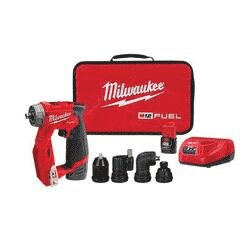 Our M12™ FUEL™ installation drill/driver kit features 4 dedicated solutions, delivering unrivaled access and control with up to 300 in-lb of max torque. Four dedicated heads, including a 3/8 in chuck, offset driver, 1/4 in hex and right angle, can attach in 16 different positions. This provides you with a 4-in-1 drilling and driving solution that is purposefully designed to reach uniquely challenging locations. The compact drill driver features a slim tool profile and an in-line grip in the back of the tool that provides ultimate tool control and unrivaled access. The top of the tool is flat, allowing the tool to be placed flush against surfaces for additional access when needed. The front of the tool is equipped with a magnetic bit holder that securely holds multiple bits, enhancing your productivity. These unique features combine with the tool's compact size and weight allowing you to maneuver the multi-head drill/driver for maximum versatility and best access in hard to reach places. The modular drill/driver is equipped with a POWERSTATE™ brushless motor, delivering you with 1600 rpm and 300 in-lb of torque. This provides you with the necessary power for installation applications, especially in electrical, cabinet installation, MRO, HVAC, automotive and remodel applications. The installation drill/driver features REDLINK™ PLUS™ Intelligence, protecting your tool from overloading or overheating. The compact cordless drill/driver is powered by Our M12™ REDLITHIUM™ battery packs, delivering you with more run time per charge and more work over the life of the pack. In addition to the 12 V tool and four attachments, a compartmentalized contractor bag is included to hold each individual head. This kit also includes (2) M12™ REDLITHIUM™ CP2.0 battery packs (48-11-2420) and an M12™ charger (48-59-2401).