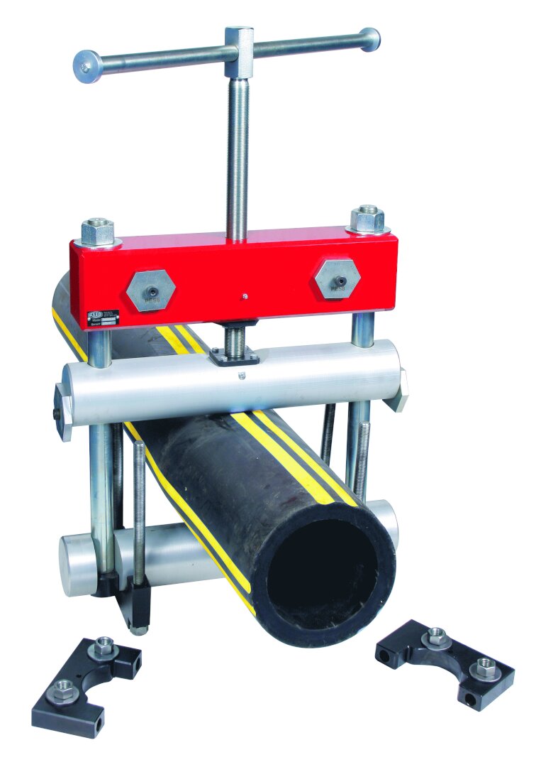 Aluminum parts reduce tool weight for easier handling. Positive stops prevent damage caused by over-clamping. Multiple size/SDR stops on one pair of stops allow using one Reed tool for quick, convenient over-squeezing protection on a variety (see Pipe/SDR Stops above) of sizes. Sliding bar handles make work in tight places easier and increase leverage for tightening. Machined aluminum squeeze bars are anodized or painted to withstand varied climate and soil conditions. Fine-pitched thread permits a controlled, low-effort squeeze. Easy to use in line because of swing bar and no loose parts. Includes an optional-use strap for lifting.