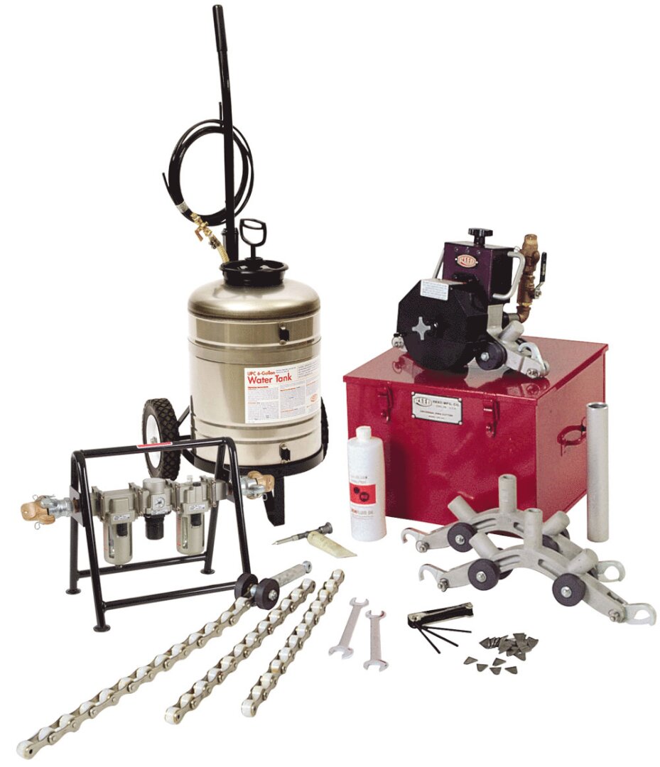 Lightweight, easy-to-use Universal Pipe Cutters (UPC) are available to cut 6 in - 48 in nominal Dia (150-1300 mm actual OD) ductile iron, cast iron, clay, concrete, steel, PVC or PE pipe. Note When cutting steel pipe with the steel blades, sparks are possible and expected Because of the sparks, the UPC cannot be used for cold cuts Reed Universal Pipe Cutters are pneumatic powered The lower cost UPC616A uses the same motor as the others, but does not need connecting frames. The UPC616 is shipped in a steel toolbox with a 3-gallon, formed-steel water tank. The UPC636A and UPC648A UPCs come in a steel toolbox with a 6-gallon, stainless steel water tank and cart UPC836APE and UPC848APE are designed specifically for cutting PE pipe. The kit includes a 6 and 8 in carbide tipped blade. The 8 in blade will cut large diameter PE pipe with a wall thickness up to 2.65 in, UPC836APE and UPC848APE also come in a steel box but without the water tank. Standard Equipment UPC616A, UPC636A, UPC648A, UPC836APE, UPC848APE Power Cutter with 1.7 HP Motor. Chain/Turnbuckle Assembly cut up to 16 in, Connection Frames & Chain to cut up to 16 in, 36 in, 48 in, 36 in and 48 in Filter/Regulator or Lubricator with Stand. Water Tank 3 gallon, 6 gallon with cart, 6 gallon with cart Carrying Case, Air Motor Oil, Grease Gun, Hex Key Wrench Set, Open End Wrenches, Wedges, UPCSTEEL6 6 in blade, UPCPE8 8 in blade. Universal Pipe Cutter Power Requirements, Maximum RPM 3675, Air Consumption 50 cfm, Pressure 90 psi Maximum, Shut-Off 3/4 in Ball Valve, Air Supply Fittings 3/4 in Dixon Air King Coupling. UPC motor reconditioning/refurbishing is available. Please send motor in freight prepaid in to our factory. Reed will handle forwarding to appropriate manufacturer Hydraulic motor repairs are priced on a case by case basis, pneumatic motor repairs are flat rate. Complete UPC cutters can also be reconditioned/refurbished. UPC cutters should arrive freight prepaid at our factory. Quotes will be issued upon inspection of the unit and labor charges apply, Call 800-666-3691 for a return authorization number.