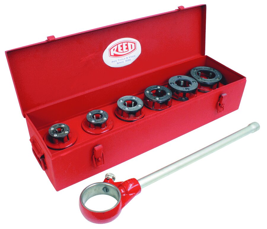 R12+ drop head threader sets include complete dropheads in sizes from 1/2 to 2 in NPT threads. Each drop head threader set has a ratchet ring and handle. In addition, the reed R12+ ratcheting ring R12RRHC accepts all RIDGID 12-R dropheads. All drop head threader sets thread steel pipe.