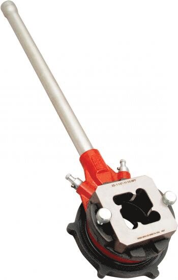 The Reed adjustable guide system and solid block dies make these the most economical, most convenient, and most versatile threader sets on the market. Because the adjustable guide system adjusts to different sizes of pipe, it is only necessary to have a die for each pipe size, not a die plus a head. Other threader sets which require a die and a head for each size take up considerably more room in the toolbox or truck. Further, with two pawls, handle swing is faster on the adjustable guide threader sets - half that of one pawl competitive sets, and best for close quarter work. Adjustable Guide Threader Sets work well on coated pipe because the die head can fit over the coating and then be tightened down into place. There is no need to peel back the coating before threading. This speeds up the job and permits maximum retention of the protective coating to extend pipe life. Adjustable Guide Threader Sets use Reed Block Dies for easy cutting and precise threading. Block dies may be used as pipe thread chasers.