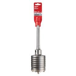 Milwaukee® one-piece carbide tipped core bits are ideal for drilling large holes where the depth is relatively shallow. The core bit cuts a kerf only. The inside core must be removed by the operator before deeper drilling can be accomplished. Use of centering bit 48-20-5495 is recommended (not included). Use drift key 48-20-5497 to remove centering bit from the one piece core bit. The one-piece core bits are available in SDS-Max or Spline shanks. They come in a variety of diameters ranging from 1-1/2 to 6 in with overall lengths of 11-3/8 in or 22 in and a drilling depth of 3 in. The asymmetric tooth pitch with alternating tooth geometries creates faster material pulverization. The one-piece design maximizes energy transfer and the thick wall core body is durable even in large hammers. The fluted core exterior minimizes friction loss and removes debris faster.