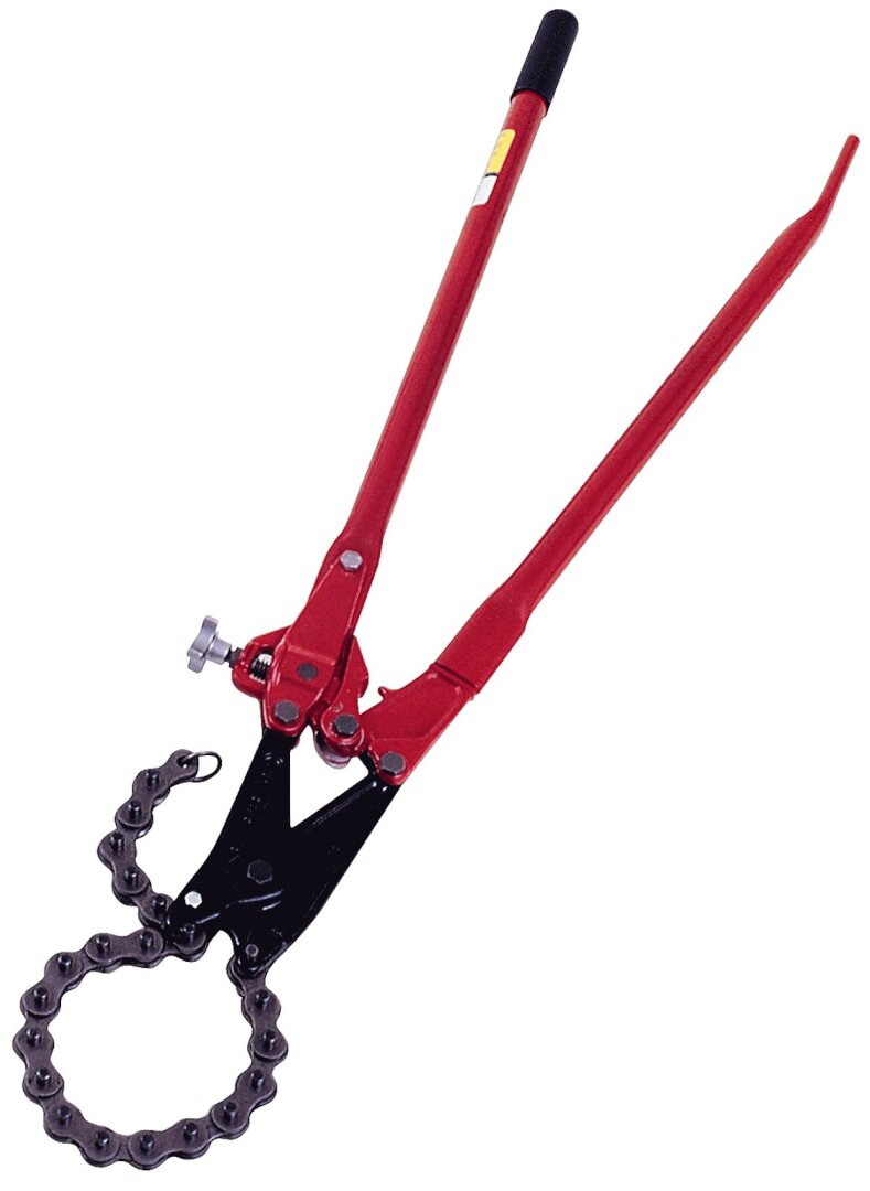 The fastest way to cut cast iron soil pipe, clay pipe and small diameter concrete pipe is with a chain pipe cutter. Reed's design provides stronger jaws and more durable adjusting screws compared to the competition. Some parts are even interchangeable. Reed soil pipe cutters are available in a single stroke SC59 model and a ratcheting SC49 model for close quarter work. Multiple use 1 /2 in male ratchet wrench ships with SC49 models. No-Hub Roller Kit is standard on all models.