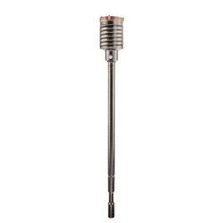 Milwaukee® one-piece carbide tipped core bits are ideal for drilling large holes where the depth is relatively shallow. The core bit cuts a kerf only. The inside core must be removed by the operator before deeper drilling can be accomplished. Use of centering bit 48-20-5495 is recommended (not included). Use drift key 48-20-5497 to remove centering bit from the one piece core bit. The one-piece core bits are available in SDS-Max or Spline shanks. They come in a variety of diameters ranging from 1-1/2 to 6 in with overall lengths of 11-3/8 in or 22 in and a drilling depth of 3 in. The asymmetric tooth pitch with alternating tooth geometries creates faster material pulverization. The one-piece design maximizes energy transfer and the thick wall core body is durable even in large hammers. The fluted core exterior minimizes friction loss and removes debris faster.