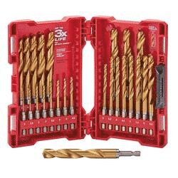 Milwaukee® SHOCKWAVE™ Impact Duty™ Titanium Drill Bits with RED HELIX™ are engineered for impacts and drills. Designed with a variable Helix™ with an aggressive 35 deg Helix™ angle which ends at 15 deg, the Impact Duty™ titanium drill bits with RED HELIX™ provide rapid chip Removal™ to limit heat build up to stay sharper Longer™. The 135 deg split point tip delivers a precision start and prevents walking for fast, accurate holes. Titanium coating can be used in all drilling applications to give you upto 3X life vs black oxide drill Bits™.